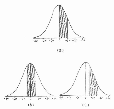 第二节 正态曲线下面积直方图是以直方的面积表示数量的。直方顶端连成曲线后,整个曲线下面积就表示总频数,用1或100%表示。一定区间曲线下面积就是出现在此区间的频数与总频数之比,或出现在该区间的各个变量的概率之和。例如以7岁男童102人为100%,则若要知道坐高在66至68cm间的人数占总人数的百分比,只要知道曲线下横坐标为66至68cm区间内的面积就可以了。因此求出曲线下面积有其实用意义。 曲线下某区间的面积,可根据曲线方程用积分求得,但若每次应用时都要用积分计算,那是很麻烦的。前人已将标准正态曲线下0至各u值的面积计算出来的了。由于各书列的方式不完全相同,所以使用时要注意表上的图示或说明,仍用7岁男童坐高资料为例说明正态曲线下面积表(附表2)的使用方法。该表左侧及上端为u值,表中数字为横轴自0至u曲线下的面积。 例5.1 根据表4.3的资料计算得坐高的X=66.72,S=2.08,试估计总体中坐高在 (1)66.72-68.80cm间。 (2)66~68cm间及(3)68~70cm间的人数各占总人数的百分比。 (1)求坐高在66.72~68.80cm 之间曲线下面积。 ①求u(u=(X-μ)/σ,这里分别以X、S作为μ与σ的估计值) (66.72-66.72)/2.08=0 (66.80-66.72)/2.80=1 标准正态曲线下面积见图5.3(a)。 ②查附表2,u自0至1的面积,即查u=1.00,得α/2=0.3413。坐高在此区间内的人数占总人数的34.13%。 (2)求坐高在66~68cm之间曲线下面积。 ①求u (66-66.72)/2.08=-0.346 (68-66.72)/2.08=0.615 标准正态曲线下面积见图5.3(b) ②查附表2 u=0.346,得α/2=0.1353(经内插法求得,下同) u=0.615,得α/2=0.2308 0.1353+0.2308=0.3661 坐高在此区间内的人数占总人数的36.61%,即102×0.3661=37.3人,与实际观察所得38人相近。