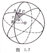 设a,b,g为三条边(即三段大圆弧长,以球半径R为度量单位),A,B,C为三个角(即三段大圆弧的两两夹角,图1.7).球面三角形的三个角之和一定大于180°,其差d = A + B + C-p叫球面角超(单位弧度),d >0.