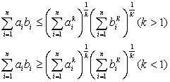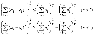 [闵可夫斯基不等式] 设ai, bi>0 (i=1, 2, L , n),又r>0, r¹ 1, 则