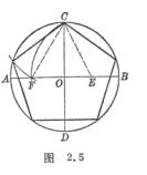 [已知外接圆作正五边形] 过圆心O作互相垂直的直径AB,CD,平分OB于E,以E为圆心,EC为半径画弧交OA于F,以CF为半径在圆周上顺次截段并连接各点,即为所求正五边形(图2.5).也可参考正十边形作法(见图2.11中的虚线).
