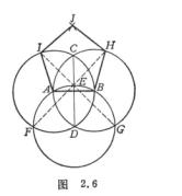 [已知边长作正五边形] 已知AB等于边长.以A,B为圆心,AB为半径画两圆交于C,D,连接CD.以D为圆心,AB为半径画圆,交CD于E,交A圆于F,交B圆于G,连接FE,GE,并延长交B,A圆于H,I.分别以H,I为圆心,AB为半径画弧交于J,连接JI,IA,BH,HJ,连同AB即为所求正五边形(图2.6).