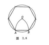 [已知边长作正六边形] 已知AB等于边长,分别以A,B为圆心,AB为半径画弧交于O,以O为圆心,AB为半径画圆.再按上法可作出所求正六边形(图2.8).
