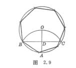 [已知外接圆作正七边形(近似作法)] 以圆周上任一点A为圆心,以同圆半径为半径画弧交圆周于B,C,连接BC,AO,交于D.以BD为半径(作图时应略大于BD)在圆周上顺次截段,并连接各点,即为所求正七边形(图2.9).