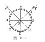 [已知外接圆作正八边形] 过圆心O作互相垂直的直径AB,CD.分别以A,B,D为圆心,任意长为半径画弧交于E,F,连接EO,FO,并延长交圆于G,H,I,J,顺次连接八点,即为所求正八边形(图2.10).
