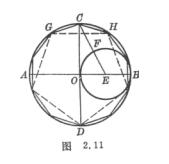 [已知外接圆作正十边形] 过圆心O作互相垂直的直径AB,CD,以OB为直径画圆E,连接EC交E圆于F.以CF为半径在圆周上顺次截段,并连接各点,即为所求正十边形(图2.11).