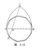 [已知外接圆作任意正多边形(近似作法)] 将直径AB n等分(n为边数),以A,B为圆心,AB为半径画弧交于C,连接C与第二个分点E,并延长交圆于D,以AD为半径在圆周上顺次截段,并连接各点,即为所求正n边形(图2.12中为正九边形).