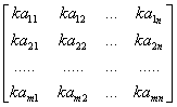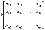 数乘矩阵时,将数乘到矩阵的每个元素上. kA=Ak k(A+B)=kA+kB (k+l)A=kA+lA k(lA)=(kl)A (k,l为任意两个复数) |