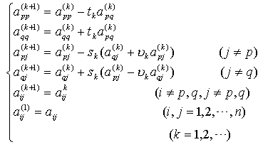 因为在这种旋转变换下,消去了矩阵中位于第p行第q列(p¹ q)交点上的元素(见本节,五),而矩阵所有元素的平方和保持不变,而且对角线上的元素的平方和增大,因而非对角线元素的平方和随之减小,因此,当旋转次数足够大时,可使非对角线元素的绝对值足够小.对于预先给定的精度e >0,如果|aij|<e (i¹ j),则可认为aij≈0.于是得到求矩阵A的特征值与特征矢量的具体迭代方法.
