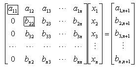 (2)在除第1行外的系数矩阵中找出主元素,不妨设b22为主元素.再将第二个方程乘以