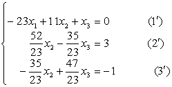 [无回代过程的主元素消去法] 这种方法与上法基本一样,不同之处在于每次消元时,都用某一方程去消去其余所有n-1个方程的未知数,例如上面方法的消元步骤(2)中,改成将第二个方程乘以