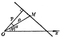 O为极点,Ox为极轴,p为极点到该直线的距离.a 为极轴与从极点引到直线的垂线之间的夹角(逆时针方向为正),j 为该直线上任一点M的极角,r 为M点的矢径 |