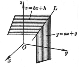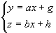 直线L是y = ax+ g 和z = bx + h两个平面的交线;通过点(0, g, h)且具有方向数1, a, b |