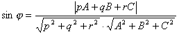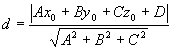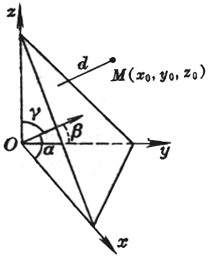 d法 = | x0cosa + y0cosb + z0cosg - p | 式中d为点M(x0,y0,z0)到平面的距离 |