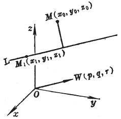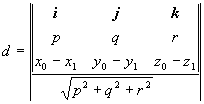 式中d为点M(x0, y0, z0)到直线L的距离,i,j,k为三个坐标轴上的单位矢量,最外面的符号“| |”表示矢量的模 |