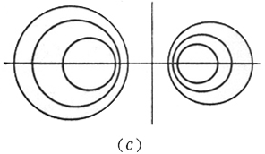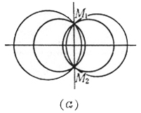 (l ¹ -1)的一个确定值, (a)如果C1和C2 相交于两点M1,M2,则束中一切圆都通过两交点M1,M2,它们的根轴就是它们的公共弦.这时圆束称为共轴圆系(图(a)). (b)如果C1和C2切于一点M,则束中一切圆都在一点M相切,根轴就是在点M的公切线(图(b)). (c)如果C1和C2不相交,则束中一切圆都不相交,根轴也与圆束中一切圆都不相交(图(c)). 从点P作两个圆C1和C2的切线,具有相等切线长的点P的轨迹就是根轴.两个同心圆的根轴是从公共圆心到无穷远处的直线.三个圆中每对圆的根轴(共三个)交于一点,它称为根心.若三个圆心共线,则其根心在无穷远处. |