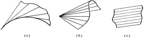 可展曲面 单参数平面族的包络面称为族的可展曲面.包络面是空间曲线的切线所构成的曲面、锥面或柱面(图(a),(b),(c)) |