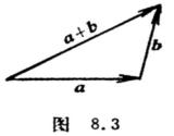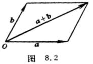 把矢量的始点移到原点O,以a,b为边作平行四边行,由原点作出的对角线就表示和矢量a+b(称为平行四边形法则,见图8.2);或者把二矢量首尾相接,由始点到终点的矢量即为和矢量a+b(称为三角形法则,见图8.3).