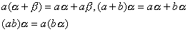 2o F中的数量与V中元素的乘法. 对F中任一数a与V中任一元α,总有唯一确定的元素δ与它们对应,称为a与α的数乘,记作![]()