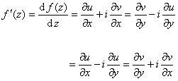 反过来,如果u(x,y)v(x,y)Σ内满足上面的条件,并且可微,那末f(z)Σ内解析.这时,解析函数f(z)的导数可以表示成下面四种形式之一: