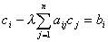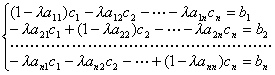 式中I为n阶单位矩阵,A=(aij),c= (c1,c2,L,cn)t , b= (b1,b2,L,bn)t 。这个方程组存在唯一解的充分必要条件是:方程的系数行列式