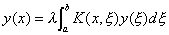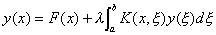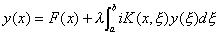 式中K(x,x)是在定义区间上平方可积的对称核,并假定在正方形k0(axbaξb)上是两变量x,ξ的连续函数,F(x)是已知的一致连续函数,y(x)是未知函数,而λ是参数,则有施密特公式