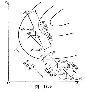 (2) 依次平行于n个方向的每一个进行相继探索,若移动是成功的,则采用新点,若移动不成功则保留基点。若在一给定方向的移动是成功的,则下一次再在这个方向上探索时,步长将增大为