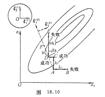 (3) 直到在每一个方向上都至少有一次成功,一次失败,这时沿该方向的探索就告结束。依次沿平行于n个方向的探索完毕后最后一次成功的点为新的基点