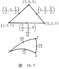 [六节点三边形] 六节点包括三边形的三个顶点和三个边的中点(图19.7)。选取面积坐标