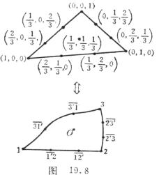 [九、十节点三边形] 九节点包括三边形的三个顶点和三个边的三分点;十节点应补加单元的形心O(图19.8),其面积坐标为