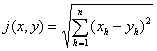 [n维欧氏空间与直角坐标法] 假定X是一个以j为尺度的尺度空间,又假定存在一个把X变上n维实数空间Rn的一对一变换f,使对X里任何两点x和y,