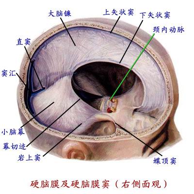 分两层。内层大部分与外层连结紧密,某些部位二层分开,形成管状腔隙称硬脑膜窦。内层某些部位折叠形成板状的大脑镰和小脑幕。