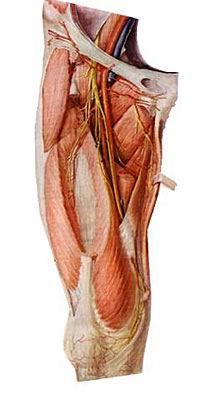 经腹股沟韧带深面,股动脉外侧进入股三角,肌支支配股肌前群,皮支支配股前部皮肤。股神经皮支有一长支,伴大隐静脉下降至足内缘,称隐神经。股神经损伤,股肌前群瘫痪,膝跳反射消失。