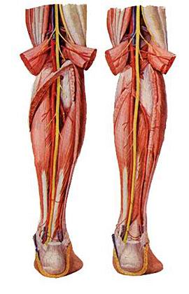 沿腘窝中线,经小腿后群肌深浅两层间下降,于内踝后方至足底分为足底内侧神经和足底外侧神经。