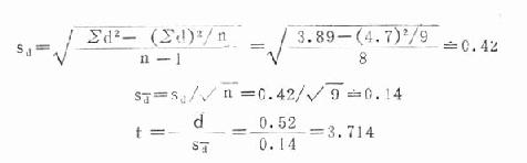 自由度v=n-1=8,查t界值表得t0.05(8)=2.306,t0。01(8)=3.355,本例t=3.714>t0.01(8),P<0.01,按α=0.05检验水准拒绝H0,接受H1,可认为治疗前后舒张压有变化,即该药有降压作用。