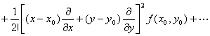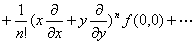 [泰勒公式] 假定在某一点(x0,y0)的邻域D内二元函数f(x,y)有直到n+1阶为止的一切连续偏导数.分别给x及y以改变量h及k,使连结点(x0,y0)及(x0+h,y0+k)的直线段不越出D外,那末f (x,y)在D内可表成形式: