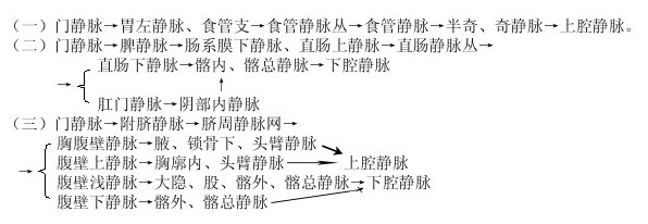 (二)门静脉→脾静脉→肠系静脉下静脉、直肠上静脉→直肠静脉丛→