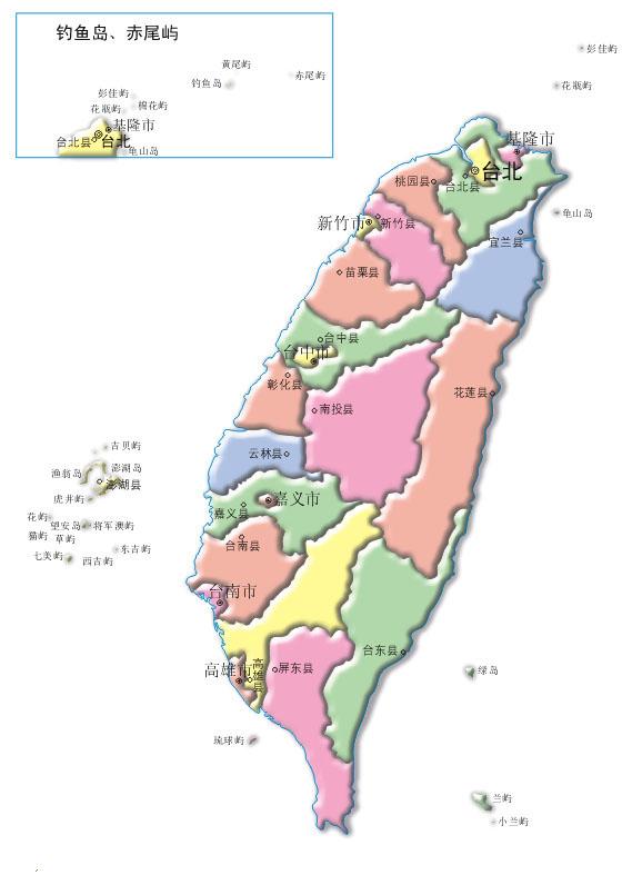 台湾现行地方行政区划分为省、县、乡三级。省、县(市)称为省、县(市)政府;乡镇县辖市,称为乡镇县辖市公所。目前,除台湾省 外,设“院辖市”(或叫“直辖市”)2个:台北市、高雄市。省下设16个县:桃园、台中、彰化、南投、云林、嘉义、屏东、花莲、台东、台北、 新竹、台南、高雄、澎湖、宜兰、苗栗;5个省辖市:新竹市、台中市、台南市、基隆市、嘉义市。 其中包括24个县辖市、22个市辖区、60个镇和225个乡。