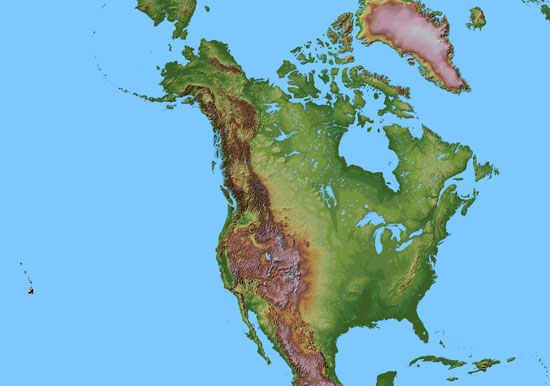 本土地势东西高,中间低,明显分为三个纵列带。东部为蜿蜒的阿巴拉契亚山地和沿海平原。中部为平原,一般海拔在500米以下。西部为科迪勒拉山系构成的高原和山地,包括落基山脉、海岸山脉、内华达山脉、喀斯喀特岭以及山间内陆高原和盆地。位于阿拉斯加州的麦金利山海拔6193米,为全国最高峰。内华达山东侧低于海平面85米的死谷是北美洲陆地最低点。主要河流有密西西比河、圣劳伦斯河、哥伦比亚河等。东北边境的苏必利尔湖、密歇根湖、休伦湖、伊利湖和安大略湖等为世界最大的淡水湖群。