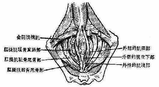 图2-98 会阴部肌肉 肛管直肠环 由外括约肌深浅两部,纵形肌、内括约肌以及耻骨直肠肌所组成,起括约功能。肛门部手术时必须注意环的部位,若不慎切断,可造成肛门失禁(图2-99)。