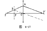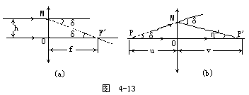 当主轴的物点P发出的任一近轴光线PM入射到透镜的M点时,图413b所示,在理想成像的条件下,出射光线MP′和主轴的交点P′为像点,此时偏向角也应相同。令物距OP=u,像距OP=v,由图b中的几何关系可知