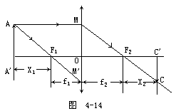 【牛顿公式】 X1表示物体与第一焦点的距离,而X2表示光像与第二焦点的距离,由图414可以看出,△CCF2~△MOF2和△MOF1~△AAF1放大率