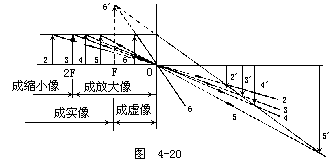 【凸透镜】 凸透镜是中央部分较厚的透镜。凸透镜分为双凸、平凸和凹凸(或正弯月形)等形式,如图49所示。薄凸透镜有会聚作用故又称聚光透镜,较厚的凸透镜则有望远、发散或会聚等作用,这与透镜的厚度有关。将平行光线(如阳光)平行于轴(凸透镜两个球面的球心的连线称为此透镜的主光轴)射入凸透镜,光在透镜的两面经过两次折射后,集中在轴上的一点,此点叫做凸透镜的焦点(记号为F),凸透镜在镜的两侧各有一焦点,如为薄透镜时,此两焦点至透镜中心的距离大致相等。凸透镜之焦距如图410所示,是指焦点到透镜中心的距离,通常以f表示。凸透镜球面半径越小,焦距越短,凸透镜可用于放大镜、老花眼及远视的人戴的眼镜、显微镜、望远镜的透镜等。