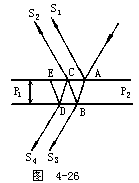 【薄膜干涉】水面上的薄层油膜,机动车在潮湿柏油道上所遗留下来的油迹,或是肥皂泡等,都会在白光中出现灿烂的彩色。所有上述的各例中,均是由薄膜干涉现象引起的。若将一用金属细丝制成的矩形框架,浸以肥皂水形成一层薄膜,然后用弧光灯的白光或阳光照射于其上,就呈现出典型的薄膜干涉。其中一部分是由反射光产生的干涉条纹,而其余的则从皂液膜中透过去。此时从反射光中可以看到许多与水平框架上缘平行的彩色横条纹。不但如此,这些横条纹还会慢慢地向下移动,愈靠近框架上缘则愈宽。此外,透射光在白幕上也显示出许多彩色横条纹,但比起反射光中的条纹要暗淡得多。如果用单色光代替白光,则彩色现象会立即消失,而出现的便是一些彩色条纹的花样类似于明暗相间的条纹。在1800年英国科学家杨格指出薄膜彩色条纹之形成,是因为干涉现象所致。如图4-26SA是一束单色光,斜射到厚度为d之皂液薄膜P1P2上。照射于A处之光线S(实际上它代表的是一个光束),一部分立即被反射,而另一部分则折射到B处。反射部分以S1来表示,折射至B处者又会照样地有一部分立即被反射,及另一部分被折射。后者仍用S3来表示。被反射的光线抵达C处,又在该处分为两部分,一部分折射为平行于S1S2,另一部分被反射后则沿CD路线而抵达D处。然后再在该处被分为两部分,一部分折射为平行于S3S4,另一部分则被反射到E处。关于薄膜上所发生之干涉现象(单色光),如果有两条平行入射到薄膜上,如图4-27中的abb在薄膜上表面的反射光线为b1a由膜的上表面折射到下表面的C点再反射到B点,又折回a1b1重合。我们可以计算出aa1bb1之间的光程差。对薄膜来说,AB的长度比光源S到薄膜的距离小得很多,因此∠BSA非常小,可以认为SASB是相互平行的。作ADSB,可以认为SA=SD,也就是说从S发出的这两条光线分别到达A点和D点时,光程是相等的。从图中可以看出,光线a在薄膜(折射率为n2)中经历路程ACB到达B点,而光线b在原媒质(折射率n1n2)中经历路程DB而在B点反射。所以这两光线之间的光程差