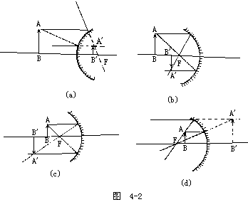 【球面镜成像】 对于凸面镜只能使特成正立、缩小的虚像。如图42a)所示。由物A点出发的平行于光轴的光线,达到镜面后将反射,其反射光的延长线必交球面镜的焦点F上。而从A射向F的光线被球面反射后将平行于光轴。这两条反射线,没有实交点,只有虚交点A′,也就是说视觉认为这两条光线是从A′发出的。物体上的B点发出的沿光轴的光线,即平行于光轴,又过焦点,故B′为B点的像。在物体AB上的各点,接照前述办法作图,其各点的像点都在AB′上,故AB′即为AB的像。无论物AB在何处,它所发出的光射到球面镜后而反射的光,没有实交点,因此所成之像必为虚像。由图中可以看出,物体在轴的上方,所成的虚像也在轴的上方,故所成之像为正立。无论AB在什么位置,从A点出发的平行于轴的光线一定在AF方向的光线的上方。此两线的交点A′必比A点更靠近轴,所以像是缩小的。根据上述方法作图可知凹透镜成像可有三种情况:(1)物在凹镜前二倍焦距以外时,是倒立缩小的实像,见图42b)。(2)物在两倍焦距以内,焦点以外时,则成倒立放大的实像,见图42c)。(3)当物位于焦点以内时,则成正立的放大的虚像,见图42c)。