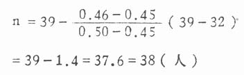 本例X1=2.6,X=2.0,S=1.3,故δ=(μ12)/σ=(2.6-2.0)/1.3=0.46。若设α=0.05,1—β=0.50,用双侧检验,查附表21,δ=0.46查不到。在这种情况下,可用邻近而略小的δ值代替,或用内插法估计。本例若查δ=0.45,得n=39,即每组需要39例,两组共需78例。若用内插法计算,当δ=0.45时所需例数是39,δ=0.50时所需例数是32,所以δ=0.46时所需例数是: