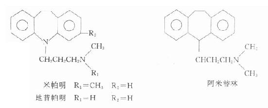 一、抗抑郁症药常用抗抑郁药为三环类,包括米帕明(imipramine)、地昔帕明(desipramine)阿米替林(amitriptyline)、多塞平(doxepin)等。它们与吩噻嗪类在化学结构上的主要区别是用-CH2-CH2-代替S。