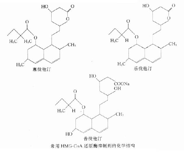 苯氧酸类氯贝特(氯贝丁酯,clofibrate)又名安妥明(atromid-s)是最早应用的苯氧酸(fibric acid)衍化物,降脂作用明显,但不良反应多而严重。新的苯氧酸类药效强毒性低,有吉非贝齐(gemfibrozil),苯扎贝特(bezafibrate)、非诺贝特(fenofibrate)、环丙贝特(ciprofibrate)等。 【药理作用】口服后,能明显降低病人血浆TG、VLDL、IDL含量,而使HDL升高。对LDL作用与患者血浆中TG水平有关。对单纯高甘油三酯血症患者的LDL无影响,但对单纯高胆固醇血症患者的LDL可下降15%。此外,本类药物也有抗血小板聚集、抗凝血和降低血浆粘度,增加纤溶酶活性等作用。 降低血浆TG、VLDL、IDL作用与增加脂蛋白脂酶活性,促进TG代谢有关,也与减少VLDL在肝脏中合成与分泌有关。升高HDL作用是降低VLDL的结果。正常时VLDL中的甘油三酯与HDL中的胆固醇酯有相互交换作用。VLDL减少,使交换减弱,胆固醇酯留于HDL中,使HDL升高。 【体内过程】口服吸收迅速而完全,数小时即达血药浓度高峰,水解后放出有活性的酸基,能与血浆蛋白结合。部分有肝肠循环,主要以葡萄糖醛酸结合物形式从肾脏排出。 【临床应用】本类药物以降TG、VLDL及IDL为主,所以临床应用于Ⅱb、Ⅲ、Ⅳ型高血脂症。尤其对家族性Ⅲ型高血脂症效果更好。也可用于消退黄色瘤。对HDL-c下降的轻度高胆固醇血症也有较好疗效。 【不良反应】苯氧酸类药物不良反应较轻。有轻度腹痛、腹泻、恶心等胃肠道反应。偶有皮疹、脱发、视物模糊、血象异常等。 HMG-CoA还原酶抑制剂 HMG-CoA(3-羟基-3-甲基戊二酰辅酶A,3-hydroxy-3-methylglutaryl-coenzyme A)还原酶抑制剂最早是从霉菌培养液中提取,有美伐他汀(mevastatin)、乐伐他汀(lovastatin)、以后又有美伐他汀的羟基化、甲基化衍生物普伐他汀(pravastatin)、塞伐他汀(simvastatin)。美伐他汀药效弱而不良反应多,未用于临床。