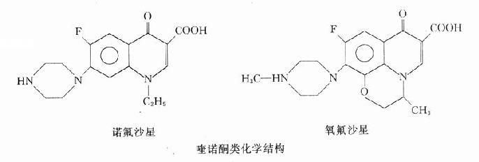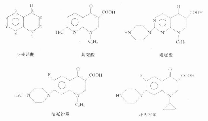 一、喹诺酮类药物概述(一)简史 萘啶酸(nalidixicacid)是1962年用于临床的第一个喹诺酮类药(实是萘啶酮),抗菌谱窄,口服吸收差,副作用多,现已不用。吡哌酸(pipemidicacid)抗菌活性强于萘啶酸,口服少量吸收,不良反应较萘啶酸少,可用于敏感菌的尿路感染与肠道感染。1979年合成诺氟沙星(norfloxacin),随又合成一系列含氟的新喹诺酮类药,通称为氟喹诺酮类(fluoroquinolones)。 (二)化学结构与作用关系 本类药物的构效关系研究表明:4-喹诺酮母核的3位均有羧酸基,6位引入氟原子可增强抗菌作用并对金葡菌有抗菌活性;7位引进哌嗪环可提高对金葡菌及绿脓杆菌的抗菌作用(如诺氟沙星),哌嗪环被甲基哌嗪环取代(如培氟沙星),则脂溶性增加,肠道吸收增强,细胞的穿透性提高,半衰期延长。在8位引进第二个氟原子,可进一步提高肠道吸收,延长半衰期(如洛美沙星等),N-1修饰以环丙基团(环丙沙星)或噁嗪基团(氧氟沙星)可扩大抗菌谱,增强对衣原体、支原体及分支杆菌(结核杆菌与麻风杆菌等)的抗菌活性,噁嗪环还可提高水溶性,使药物在体内不被代谢,以原形经尿排泄。