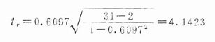 查t值表,t0.01(29)=2.756,本例tr=4.1423>t0.01(29),P<0.01,按α=0.05水准拒绝H0,接受H1,可以认为临产妇24小时尿中雌三醇浓度与初生儿体重有正相关关系。