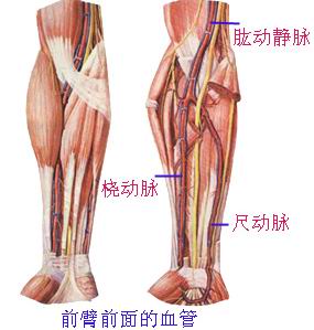 (3)尺动脉和桡动脉:分别沿前臂尺侧和桡侧下降,布于前臂和手。 (3) the ulnar artery and radial artery: namely, along the ulnar and radial forearm drop cloth on the forearm and hand.